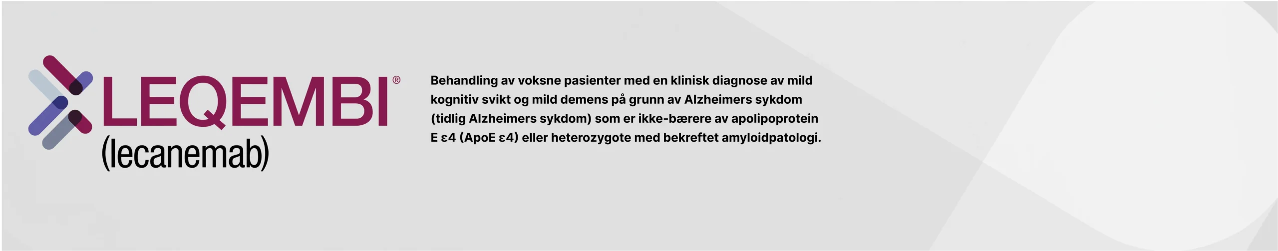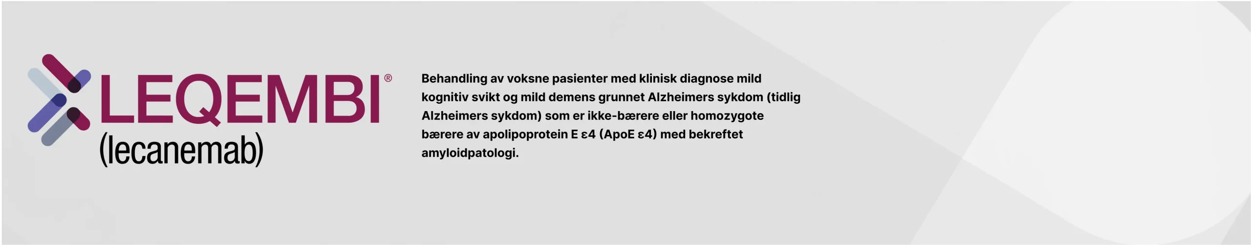 LEQEMBI er indikert for behandling av voksne pasienter med en klinisk diagnose av mild kognitiv svikt og mild demens på grunn av Alzheimers sykdom (tidlig Alzheimers sykdom) som er ikke-bærere eller heterozygote bærere av apolipoprotein E ε4 (ApoE ε4) med bekreftet amyloidpatologi.