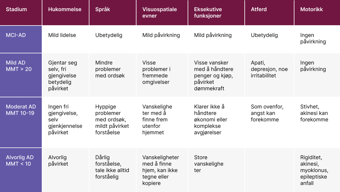 Etter hvert som sykdommen utvikler seg, forverres hukommelsessvekkelsen gradvis, og nye symptomer dukker opp, som språkforstyrrelser, svekket planleggingsevne, ukoordinerte muskelbevegelser (apraksi) og vansker med å bedømme avstander og størrelsesforhold (visuospatiale vansker).2 Tabellen ovenfor presenterer de vanligste symptomene for ulike stadier av sykdommen.